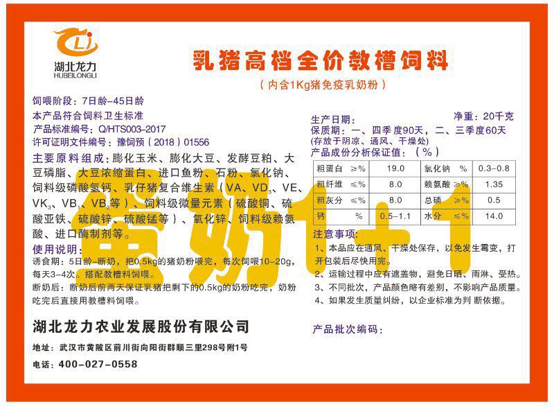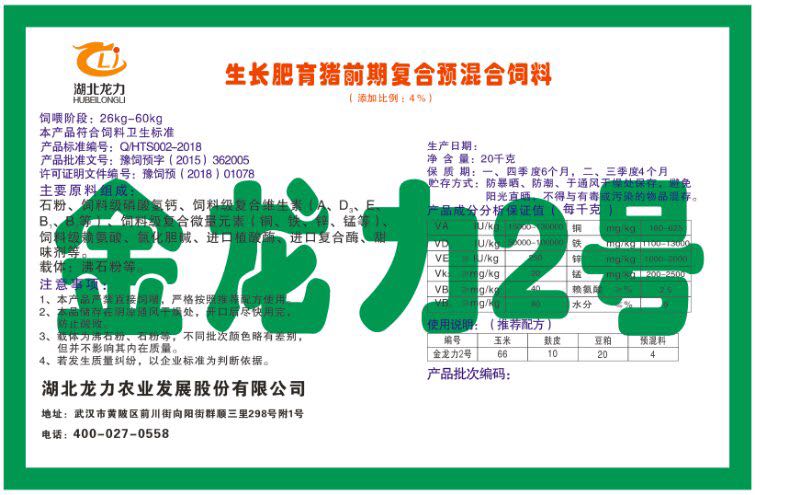 湖北龍力農業發展股份有限公司坐落于武漢市黃陂區前川街向陽街群順三里298號附1號。公司成立于2014年6月,公司自成立以來把“創全球最大養豬綜合服務”為企業愿景。致力于打造教保料品牌”作為公司發展的明確目標。公司一直致力于豬營養的研究和開發,積極與國內外高校和科研機構合作,推廣養豬技術、動物營養新概念,向世界農牧企業學習與合作。公司采用國內先進的生產工藝,選擇高精度電子配料秤,高均勻度、無殘留混合機等先進設備....